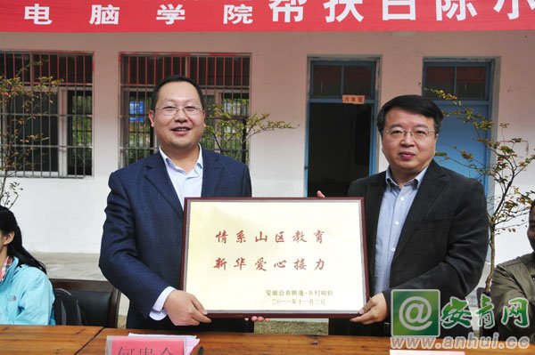 安徽電視臺公共頻道向安徽新華電腦專修學院授助學紀念牌袁勝總監(jiān)表達了對安徽新華電腦專修學院熱心社會公益事業(yè)的誠摯感謝,他說:“在‘走基層、轉(zhuǎn)作風、改文風’活動前期的調(diào)查走訪中發(fā)現(xiàn)了山區(qū)教育存在的困難,此新聞一經(jīng)播出后,就獲得了安徽新華電腦專修學院的大力支持,他們積極地為山區(qū)學校捐贈了電腦、書架、電腦桌椅、電子琴、數(shù)碼相機等物資,并進行音樂課和計算機課支教工作,不僅解決了學校的教學設施設備問題,同時也豐富了學生們的課外生活。”