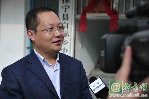 在白際小學的捐贈儀式現(xiàn)場,安徽新華電腦專修學院何貴金院長接受安徽電視臺的采訪