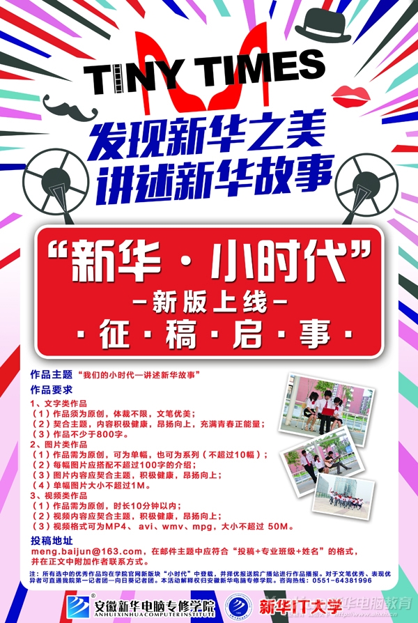 為展現新時代下安徽新華電腦專修學院學子積極向上的精神風貌,凸顯新華學子豐富多彩的學習生活,讓每一位學生充分展示自己的才華,經學院領導研究決定,將在安徽新華電腦專修學院官網開辟“新華·小時代”這一嶄新的版塊,直接面向廣大學生群體。同時,為更加貼近時代特點,將在貼吧、微博、微信等新媒體平臺陸續開通服務。感受IT生活,傳播正能量!