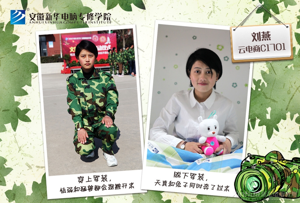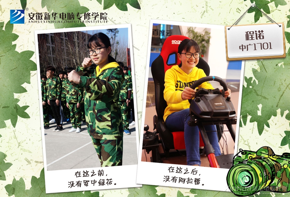程諾說,每個人都會遇到一件事、一些人,讓你頓然明白,原來我還可以這樣。左邊是英姿颯爽的軍中綠花,右邊是呆萌可愛的現實阿拉蕾,在安徽新華電腦專修學院,我就是不一樣的我,程諾。