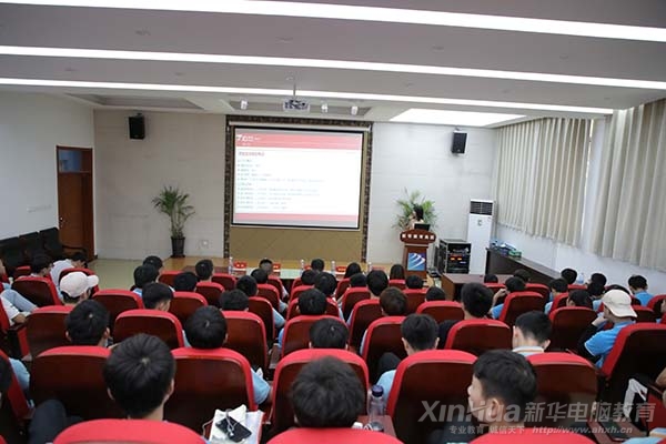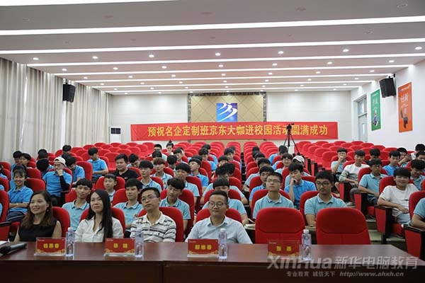 安徽新華電腦專修學院五號樓一樓學術報告廳舉辦了名企定制班京東大咖進校園活動。十點左右學生們就坐在報告廳,等待跟企業大咖零距離交流。
