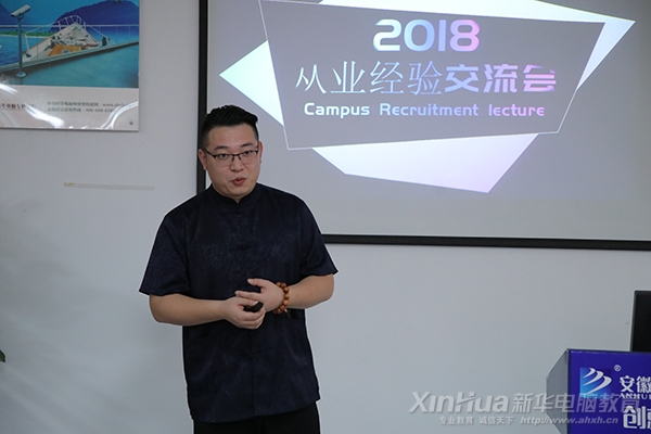 安徽新華電腦專修學院創就業指導中心學生就業指導課面授廳。學院14年電子商務專業畢業的杰出校友楊志龍給學弟學妹們分享自己的就業、創業經歷。