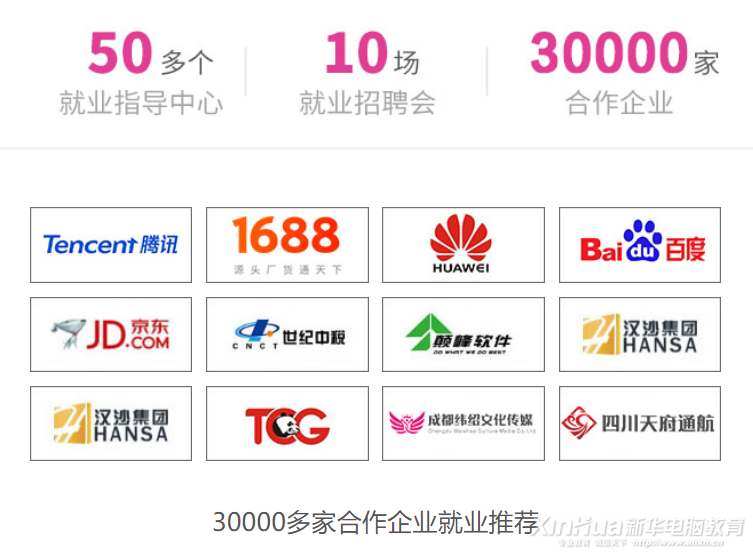新華在全國擁有多個創(chuàng)就業(yè)中心,數(shù)百位創(chuàng)就業(yè)指導(dǎo)師貼心服務(wù),體系化就業(yè)網(wǎng)絡(luò)覆蓋全國。我們與聯(lián)想、騰訊、百度等數(shù)萬家知名IT企業(yè)達(dá)成長期訂單式校企合作關(guān)系,推薦畢業(yè)學(xué)生成功就業(yè)。