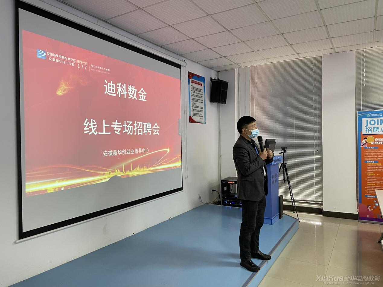 冬去春來又一年畢業學子即將走出校園,近期安徽新華創就業指導中心通過舉辦線上專場招聘會的方式,助力每位畢業生足不出校、輕松就業。4月13日,安徽迪科數金科技有限公司線上專場招聘宣講會如期舉行,讓學生深入了解企業,選擇理想崗位。