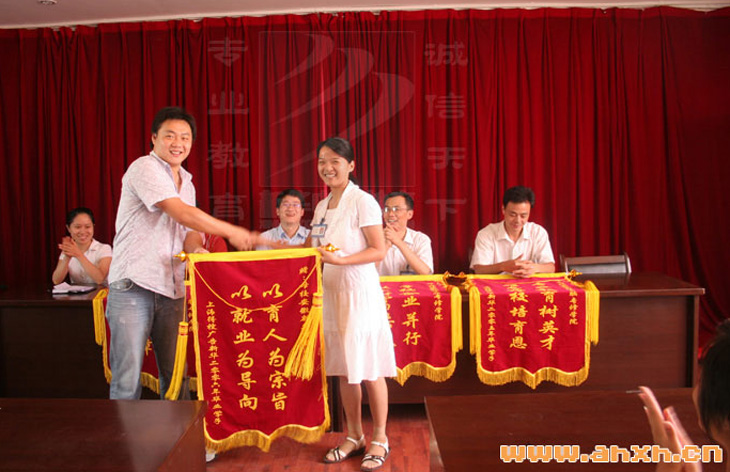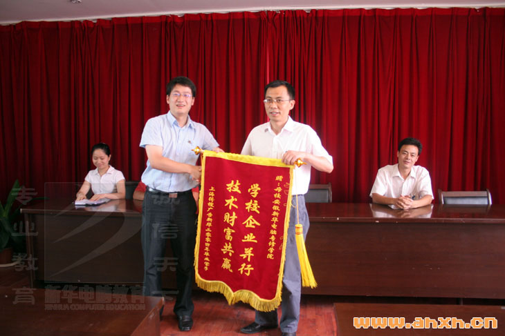 贈旗儀式在西區第一會議室隆重舉行,上海得搜廣告公司經理韓璐、安徽新華電腦專修學院副院長束開俊、院就業辦主任鄭成鯤、院西區主任張榮福以及老師代表和部分在校學子參加了儀式。