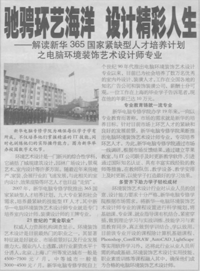 10月18日,《合肥晚報》報道:“馳騁環藝海洋 設計精彩人生——解讀新華365國家緊缺型人才培養計劃之電腦環境裝飾藝術設計師專業”,敬請關注!