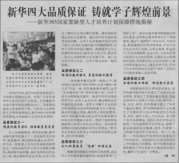 9月26《中國(guó)青年報(bào)》報(bào)道:“新華四大品質(zhì)保證 鑄就學(xué)子輝煌前景——新華365國(guó)家緊缺型人才培養(yǎng)計(jì)劃保障措施揭秘”,敬請(qǐng)關(guān)注!