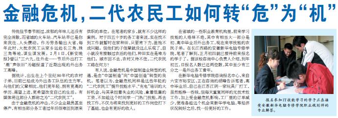 當(dāng)前位置:首頁 > 新聞中心 > 青春新華 > 《合肥晚報(bào)》報(bào)道:金融危機(jī),二代農(nóng)民工如何轉(zhuǎn)“危”為“機(jī)”