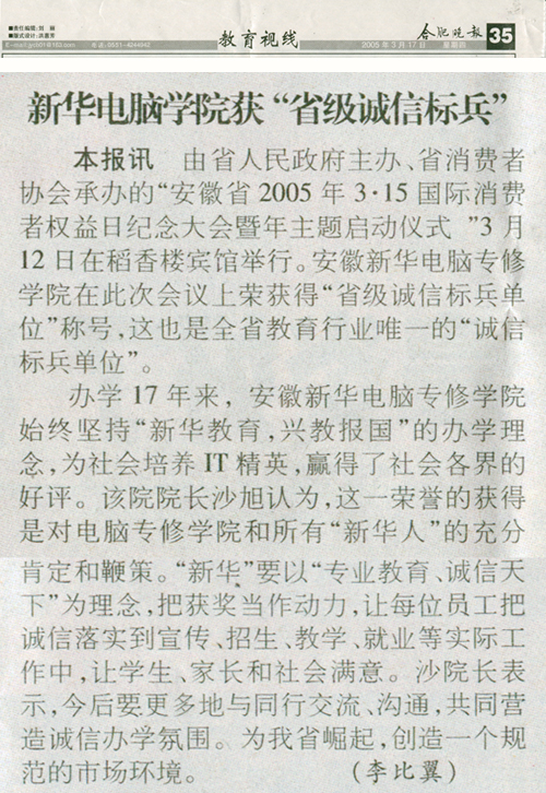 3月17日,《合肥晚報(bào)》教育教育視線專(zhuān)版(35)報(bào)道“新華電腦學(xué)院獲省級(jí)‘誠(chéng)信標(biāo)兵單位’的消息,并做了詳細(xì)報(bào)道,敬請(qǐng)關(guān)注!