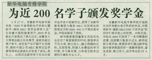 3月17日,安徽新華電腦專修學(xué)院“2005年春季新生開學(xué)典禮暨新華·微軟MLC獎學(xué)金頒獎大會”在安徽大劇院隆重舉行,2000多名新生代表參加了典禮儀式。安徽省人大常委會副主任朱維芳、省政協(xié)副主席盧家豐、省信息產(chǎn)業(yè)廳副廳長吳曉明、微軟中國公司MLC教育總監(jiān)李秦等領(lǐng)導(dǎo)出席典禮并發(fā)表了講話。典禮上,近兩百名新華學(xué)子在本次獎學(xué)金評選中脫穎而出,獲得了由新華教育集團與微軟MLC共同頒發(fā)的獲獎證書和2000-500元不等的獎學(xué)金,并現(xiàn)場接受了頒獎。