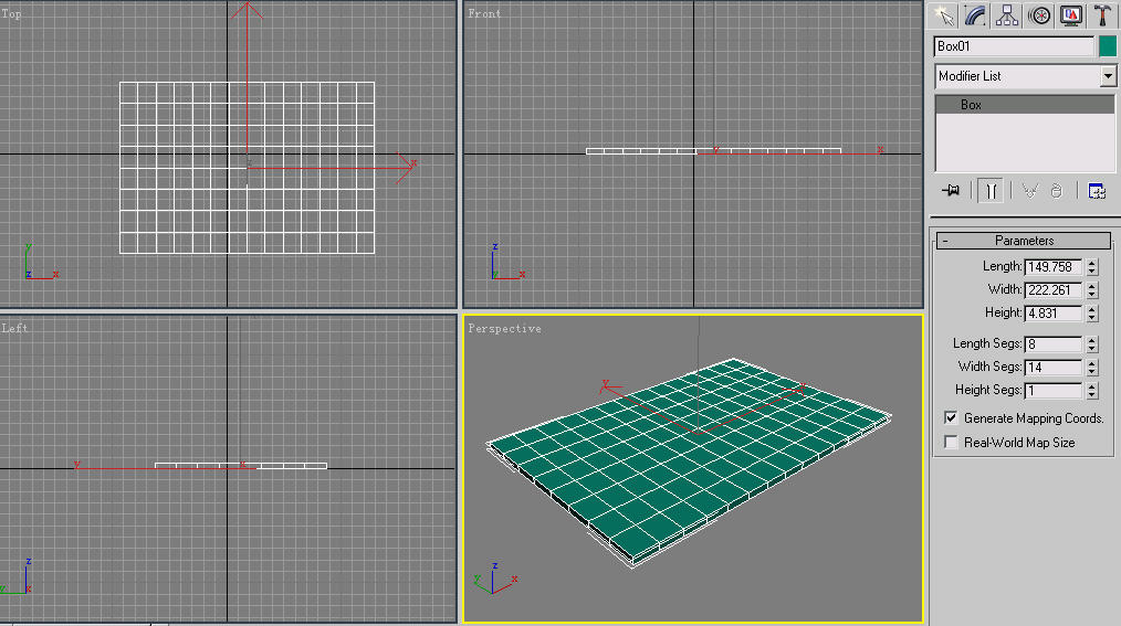 (1) 在頂視圖中創建一個box物體,設置其參數如圖1-1所示,用它來做為枕頭的原型。