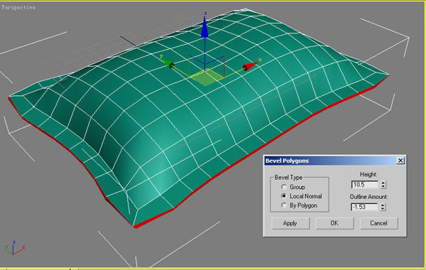 (7)將模型右擊塌陷為多邊形模型,選擇中部的表面,對其執行“Bevel(倒角)”操作,設置參數如圖1-7所示。