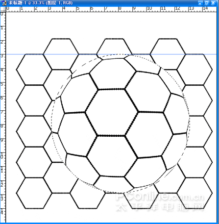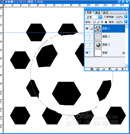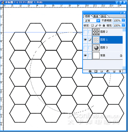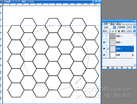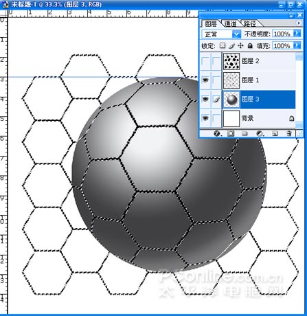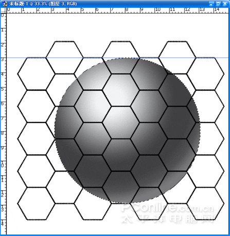 (13)把球形圖層放置背景層之上,關閉球形和黑色六邊行所在圖層。選中網格形狀圖形進行編輯。