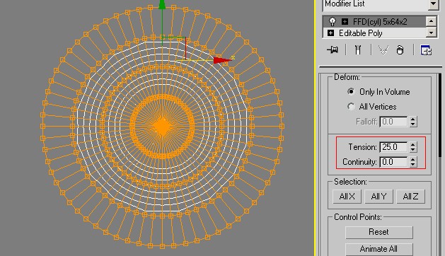 12. 查看這個對象邊的個數(shù),并賦予【FFD(Cyl)】(自由變換圓柱形工具),注意調(diào)節(jié)這里的【Continuity】(連續(xù))參數(shù),這個參數(shù)主要是為了控制變形對象的彈性。如圖XOJP—13所示。